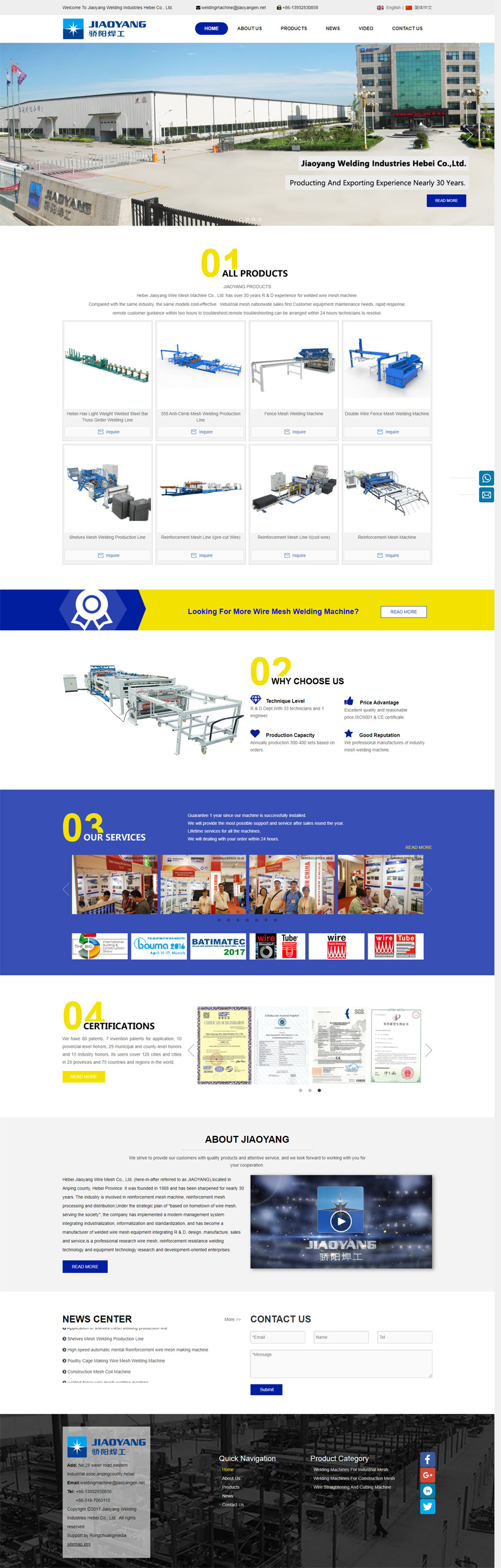河北驕陽(yáng)絲網(wǎng)設(shè)備有限責(zé)任公司坐落于聞名全國(guó)的絲網(wǎng)之鄉(xiāng)——安平,成立于2000年,占地20畝,現(xiàn)有資產(chǎn)4000萬(wàn)元,員工200多人,各類技術(shù)人員70多人,機(jī)械設(shè)備100多臺(tái)套,是專業(yè)生產(chǎn)絲網(wǎng)焊接設(shè)備的制造企業(yè)。公司研制的鋼筋網(wǎng)排焊機(jī)的主要構(gòu)造先后獲得了五項(xiàng)國(guó)家專利,技術(shù)水平處于當(dāng)今電阻焊行業(yè)的前沿。 我公司于2002年通過ISO9001質(zhì)量管理體系認(rèn)證;2004年被評(píng)為項(xiàng)目建設(shè) 單位,2007年、2008年度信用優(yōu)良企業(yè),科技進(jìn)步 單位;2006年底公司取得了自營(yíng)出口權(quán);2008年4月公司研制的鋼筋網(wǎng)排焊機(jī)通過河北省產(chǎn)品質(zhì)量監(jiān)督檢驗(yàn)院檢驗(yàn)合格。 目前,公司產(chǎn)品銷售網(wǎng)絡(luò)已遍及新疆、黑龍江、遼寧、江蘇、內(nèi)蒙古、海南、廣西、廣東、湖南、湖北、上海、福建、浙江、海南、北京等全國(guó)各地,并出口至加拿大、烏克蘭、伊朗、新西蘭、泰國(guó)、俄羅斯、南非、印度、巴基斯坦、韓國(guó)等30多個(gè)國(guó)家和地區(qū)。 今天的驕陽(yáng)已發(fā)展成集研發(fā)、設(shè)計(jì)、制造、貿(mào)易為一體的綜合性實(shí)體公司,驕陽(yáng)人一如既往地秉承之前的創(chuàng)業(yè)精神,引進(jìn)與運(yùn)用現(xiàn)代化的管理模式,迎合未來(lái)的市場(chǎng)需求,竭力滿足不同客戶的需求,力爭(zhēng)早日把驕陽(yáng)打造成中國(guó)的民族品牌!