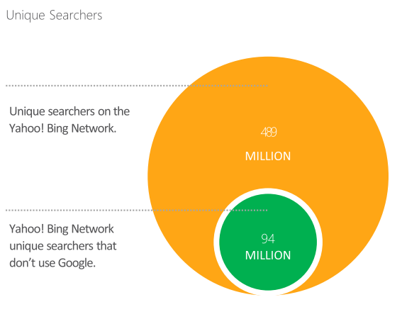 2)必應(yīng)+雅虎的用戶中有19.3% (9400萬)的搜索用戶不使用Google,這些用戶只能通過必應(yīng)+雅虎才能觸達(dá)。在美國(guó),微軟和雅虎月搜索請(qǐng)求達(dá)60億次,占市場(chǎng)近1/3。月覆蓋用戶達(dá)到近1.6億,達(dá)90%。 其中, 4730萬用戶只使用必應(yīng)和雅虎搜索,而不使用Google。