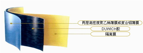它是由兩層高密度聚乙烯薄膜或復(fù)合鋁薄膜做表面材料,以DUWICH膠做中間層,輔之以隔離材料,同時表面做過特殊處理的自粘防水卷材。這種高質(zhì)量的、先進的薄膜經(jīng)過兩次壓合與化學(xué)粘合,使各層面緊緊粘合在一起,物理特性上比傳統(tǒng)的低密度聚乙烯有很大的改善。其撕裂強度、抗穿透、抗沖擊的性能都得到了提高,因而抵抗意外破損的能力也提高了。